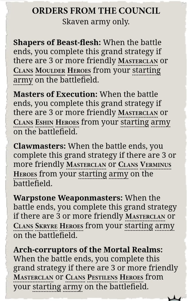 - Grand Strategy. This is the real gap for Skaven nowadays – your book options are probably your best bet, but they are all really “win more” rather than a difference-maker. Slaughter of Sorcery is a popular go-to for lots of factions currently, but a plan that revolves around your own Verminlord, Thanquol and support casters all biting it has obvious drawbacks. The rats are below the curve here.