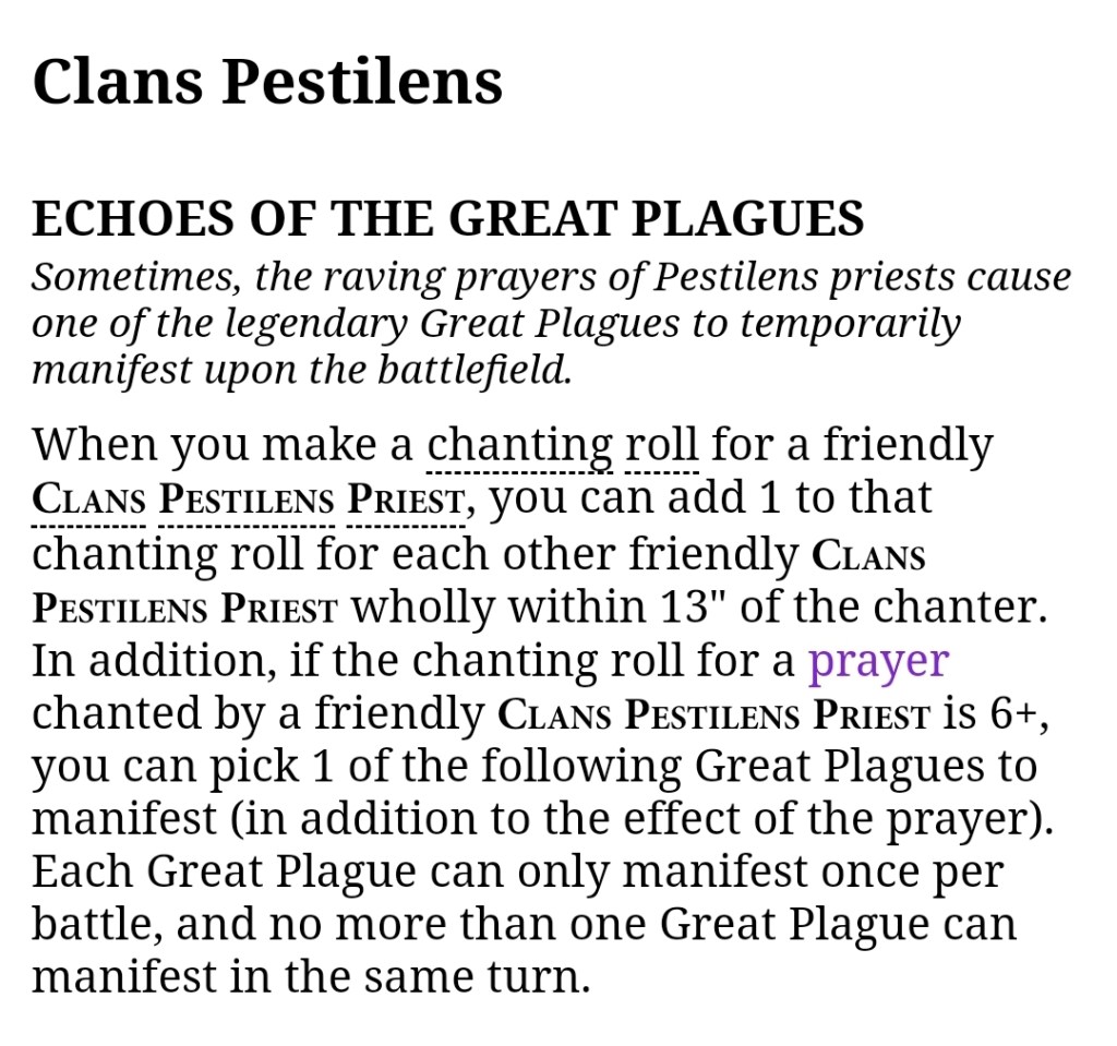 Crescendo of the Diseased Choir: Successfully chant 3+ Prayers with your Pestilens Priests. This is steering you to taking multiples, which is convenient, because you also get chanting bonuses for having a bunch of them huddled together. Your Priest options are the 100 point Plague Priest and the newly-mobile 270 point Furnace, so committing to 3 of these things is quite the undertaking; but you will at least be hitting your Prayers on a 2+, and as soon as you hit one decent roll, that’s a 2+ rerollable.