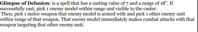 The kick in the dick here is that the lost of leadership is permanent and stackable. Spend a couple of turns in combat with that buffed up Anvil unit and they’re at neg 3 leadership for the rest of the game, fighting last and getting torn to bits by the rest of your army. Worth noting here that Core Rule 22.2.1 does specify that you can never reduce a characteristic below 0 however.
