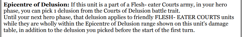 This is his big army-wide buff and it’s honestly pretty good. At full health, which he should be most of the time you will get two Courts of Delusion buffs on the bulk of your army. It gives you a chance to take one of the always useful buffs permanently and pivot with the second. Say The Grand Tournament giving you a plus 1 to hit while charging (not for Ushoran), and use the others as required, like with the plus 1 to save when you are getting brassed up first turn. This one should reward smart play.