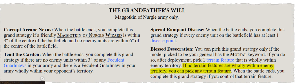 • Grand Strategy.  The GHB Grand Strats are often “win more” and are variations on have stuff left at the end of the game / stop your opponent having stuff left.  In this context, having an absolute gimme in the book can swing tight games without any skill or good fortune required – Tzeentch and Fyreslayers are the benchmark here, offering you a 3-0 headstart in every game for no real reason.