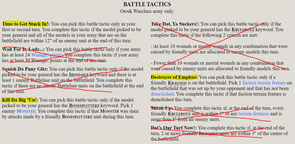 The sheer amount of red pen on that graphic illustrates just how aggressively Bonesplitterz have been screwed over. And I’m being generous by not crossing out the Kragnos one, because it’s not really a Bonesplitterz tactic: it requires a 720-point Not Bonesplitterz unit and it only ever works on a 3+.