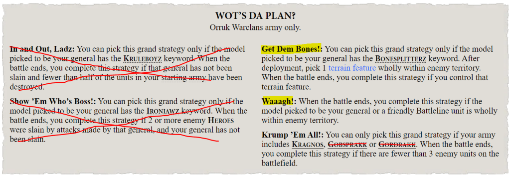As for the generic GHB Grand Strats, Bonesplitterz can score a few of these reasonably well, but worse than other armies: you’re not a magic dom, and your units are fragile as fuck. Most of them rely on keeping stuff with a 6+ save alive so in relative terms (which is literally the only measure that matters), it’s not great. I usually just take Waaagh! competitively.