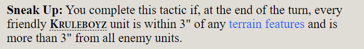 • Flavour. Getting hit with the “thematic” stick in Battle Tactics is usually a sign that you’ve been stiffed with something random and dumb, like the one in Sons of Behemat where you have to hit a series of dice rolls to fling a model around to achieve Man-skittles.  While it won’t always help you to hit those consistent 10+3 VPs, good design that makes tactics actually interesting deserves some kind of recognition.