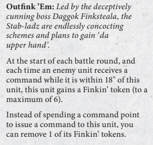 He’s a borderline bargain at 200 points, so if you already liked him, you can make the most of those Finkin Points by issuing CAs for free on the Stab-Ladz and then a second time on a bigger unit. One good use-case of this would be having two pops at Redeploy to get an extra chance at hitting lucky with a big number, and blocking off a charge lane to your heroes. He also gives Battleshock protection (like all Killabosses) so you can use IP on these guys without risking a bigger Battleshock on a massive block of Gutrippaz.