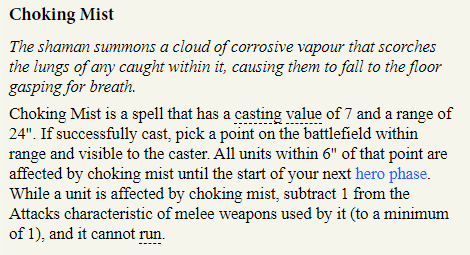 Perhaps the most popular spell in the KB roster, thanks to its extended range, you can absolutely cripple a unit with -2 attacks if you manage to hit both. And there’s inherent redundancy there too in that you can fail either the cast or the 4+ check, and still hit the other.