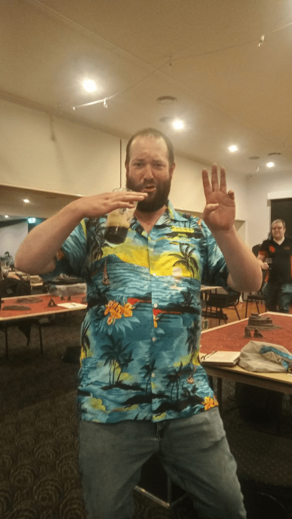 So there you have it folks, a bit of insight into the thought processes of a true Warhorse who has a very good chance of making it to the final 8 with a goofy Stormcast list. Looking over the interview it’s Joel’s awareness of the effect of the conditions that stands out to me. While he is being a bit tounge in cheek, Cancon is held in what amounts to an aircraft hangar full of sweaty nerds in the middle of the Australian Summer. ”Win your games early” might sound like genius advice on a par with “Don’t leave your models at home.” But it also means take a list that will finish your games early either way. You could be playing a game in 45 degree heat5 on the Friday so leave the 80 Plaguebearers at home6. Won’t hurt with sports votes either I guess. See you in the next interview with The First Timer.