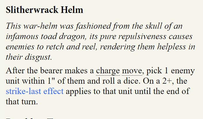 King’s Gitz is the summoning subfaction but rather than doubling down with Clammy Hand for two dice rerollable, Sam’s taken Chilled Shammy to know the whole snow-spell lore. Encroach on his Loonshrine and wear a Blizzard to the face would be the general idea, but he does have a couple of sweet Hoarfrost targets too. The Lances might already pop off at rend -2 on the charge, but the Squigs they’re riding on could use the extra rend, and they definitely don’t mind hitting on 2s instead of 4s if you roll low.