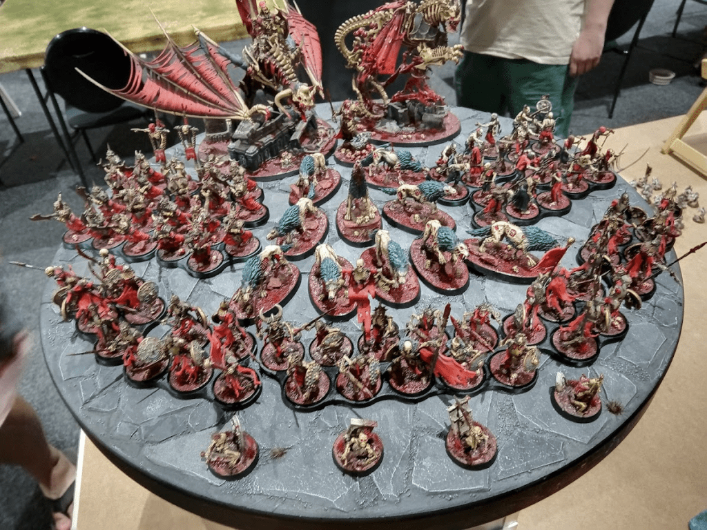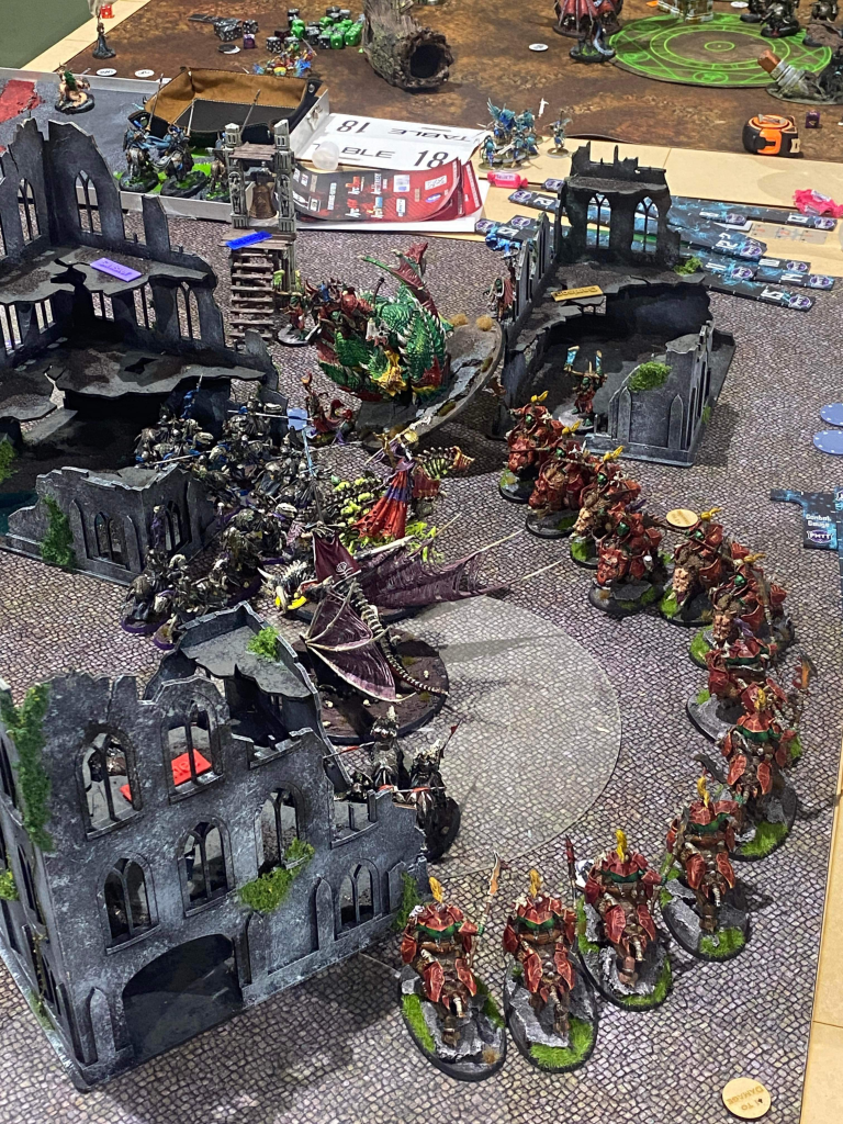 “I got to finish off yet another event against Soulblight. My lucky day. Jake was running monster mash with an ethereal Zombie Dragon, Neferatta AND Manfredd. Like the game against Terry, this was another very tactical game. I ended up killing all 3 of his big ‘uns but Soulblight still just have too many bodies to deal with. We were playing Nexus Collapse and there was only the one objective left by the end, and it was a case of too little too late for me. We both denied our grand strats and called it a day with a 15-18 score. I’d really like a second crack at Jake sometime down the track as he plays the game similar to myself. Happy go lucky but likes to play hard and fair. The best kind of wargamer in my opinion.”
