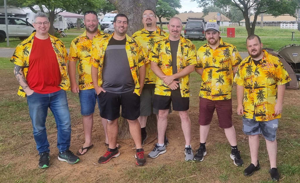 Firing up the Barbie5 : The First Timer on the left in front of the BBQ, the Filthy Casual on the right waving in the blue hat, the Veteran front left necking a stubby