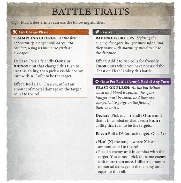 Now let’s close it out by looking at the top and the bottom of the warscroll. Note that the Header describes this as an “Ogor Mawtribes Warscroll”. This at least implies that he could have different scrolls in different Destro Battletomes, which is interesting. Let’s just hope it doesn’t mean he’s on a 6+ save in Gits because “fun”.