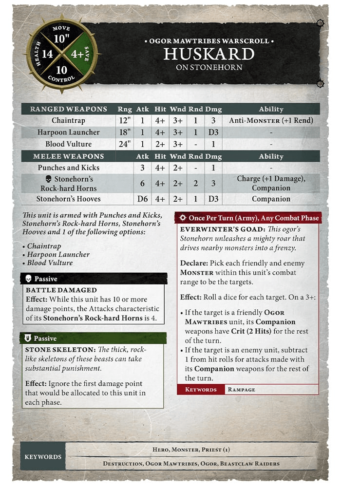 Meanwhile at the bottom of the scroll, we see the Ogor Mawtribes keyword. This dangles the promise of keyword synergy, although we haven’t seen any yet – the Battle Traits are race-locked to Ogors which he doesn’t have. Also the Huskard does benefit Ogor Mawtribes units, but only their Companions, which again Kraggy doesn’t have. So there’s nothing really in that reveal to hook our shiny new keywords into, but it’s something to look out for as we see more rules, at least.