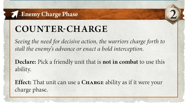 • Possibly the most impactful change in 4th edition of Age of Sigmar is the inclusion of the new Counter-Charge command–contrary to its title, you don’t need to wait until your opponent charges with one of their units to issue it. Instead, if it is your opponent’s charge phase, after they are all done you can issue Counter-Charge to any one of your units and get a charge attempt with them, which makes deepstriking shooting units a real liability because–again–there’s no overwatch now in the charge phase in AOS!