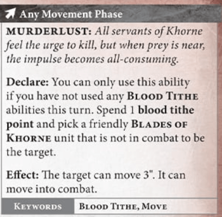 - This occurs in any player’s movement phase, which goes way back to 1st Ed 8-point Blood Tithe Khorne summoning. AKA: The good old days. Your opponent takes the first turn in the round, you summon/return at the end of their movement phase (out of harm’s way), move in closer in your own movement phase and choppity chop. It’s amazingly powerful and a lot of Khorne players are going to learn to love it.