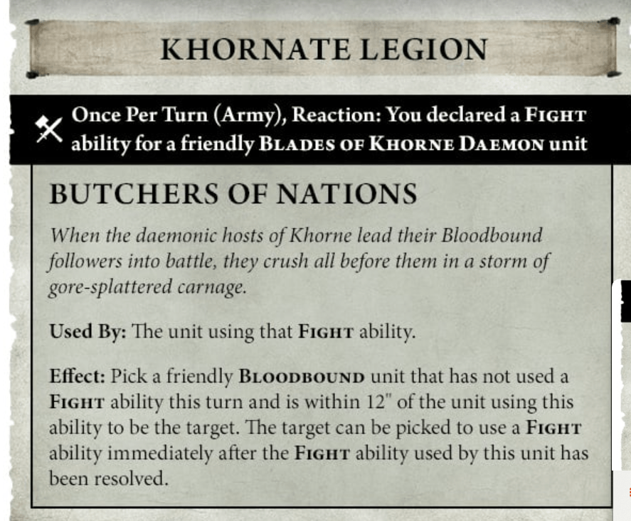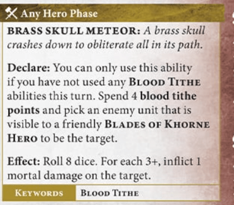 Costs an extra Blood Tithe but does much more reliable damage, so well worth it. I can see this one going up once people start Zeroing out support heroes just for looking at them funny. The extra lethality of this probably explains why they changed the targeting provisions, limiting you to targets that are visible to a friendly Blades of Khorne Hero. Old Khorne used to be able to hit anything, anywhere. Calling in the holy artillery seems like more of a Stormcast thing, but oh well. Barring an FAQ this 100% does beat the targeting provisions for Guarded Heroes so good luck hiding behind those Clanrats, Mr Warplock Engineer