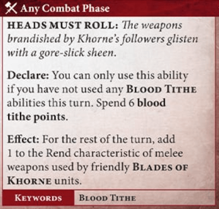Garbage, just garbage. Presumably included to remind Khorne players of their history in Age of Sigmar. 8 points gets you a bonus attack for the game, 6 points gets you a point of rend for a turn? You can only consider this a missed opportunity. The obvious answer here is an army-wide heal like back in 2nd Ed. Some people don’t think that’s a Khorne thing but the lore is full of Wounds scabbing over and Bloodbound fighting on with impossible injuries. Failing that a ward for turn, turning off wards, Crits to mortals. Anything but rend, bleugh.