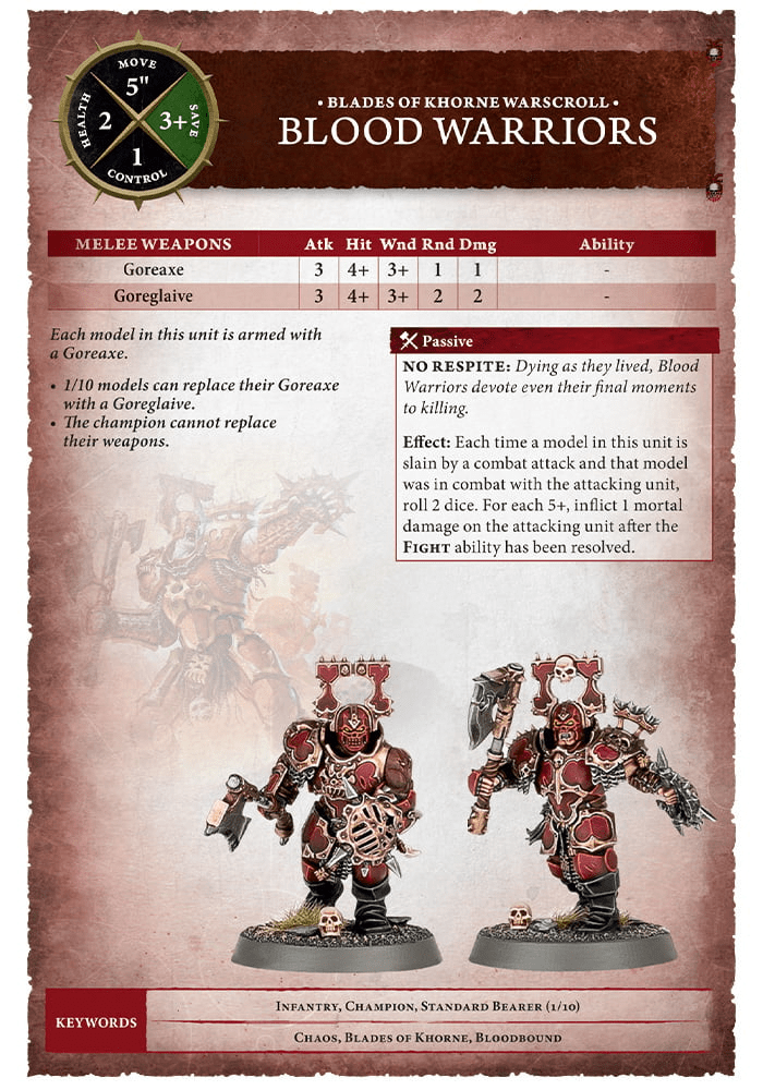 Another disappointment, the Blood Warrior continues on its merry way as the off-brand, red-coloured Chaos Warrior. I do wish they’d give these guys something more thematic. They kept murder rolls on their Warscrolls so they do retributive damage like they were two Zombies stuffed in a suit of armor, but only if you kill them in combat. They’re still cool with being ploughed under with charge mortals. Goreaxes are gone, they kept 3 attacks but they’re hitting on 4’s cause they aren’t elite enough. Meh.