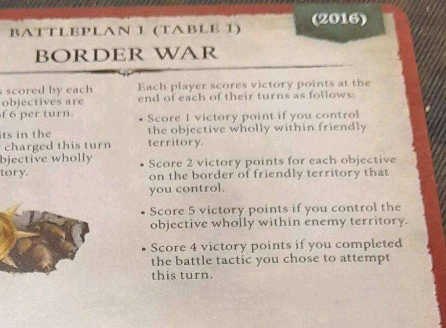 Basically the same situation again as Border War. Potentially needs an FAQ (or TO ruling) on whether you can score 5 VPs on more than one objective in enemy territory – although again that’s less dramatic than you might think, because Primary scoring is capped at 6 VPs per turn.