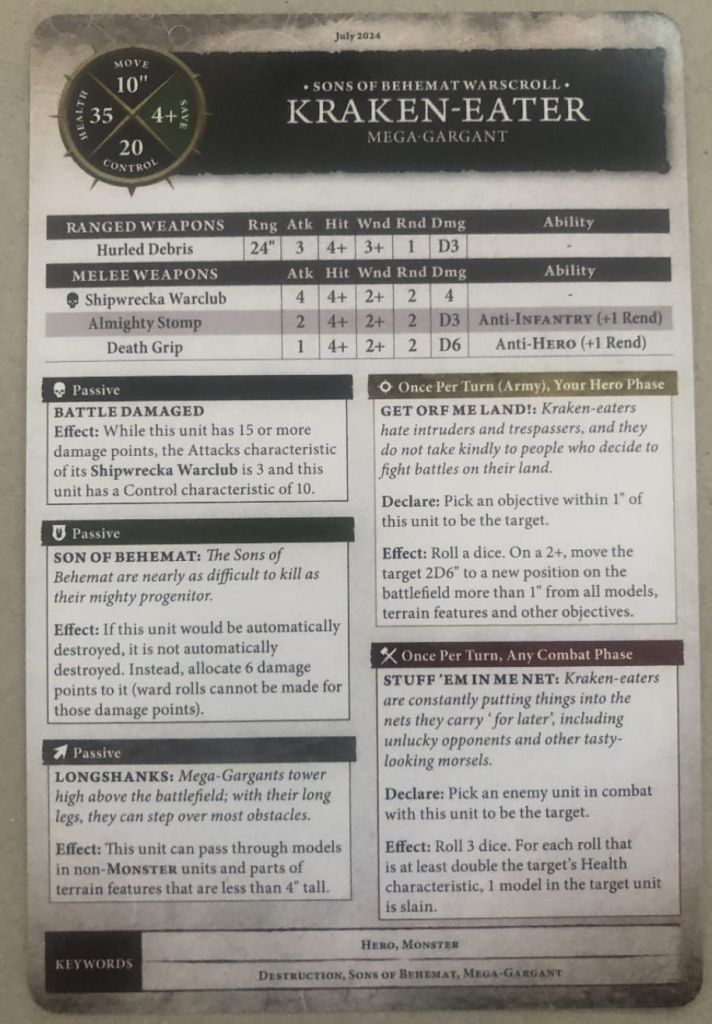 Given that Kraken-eater was already not popular (at all), he probably needed a bump relative to the others, but GW hasn’t really delivered that on his warscroll. They have kept the piss-weak output, and actually made Get Orf Me Land worse by locking it behind a 2+ roll. 2D6 is already extremely variable so if they’re doing that, it could probably have been smoothed out to D6+4″ or similar. That’s something to consider for the eventual battletome.
