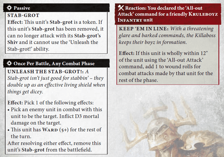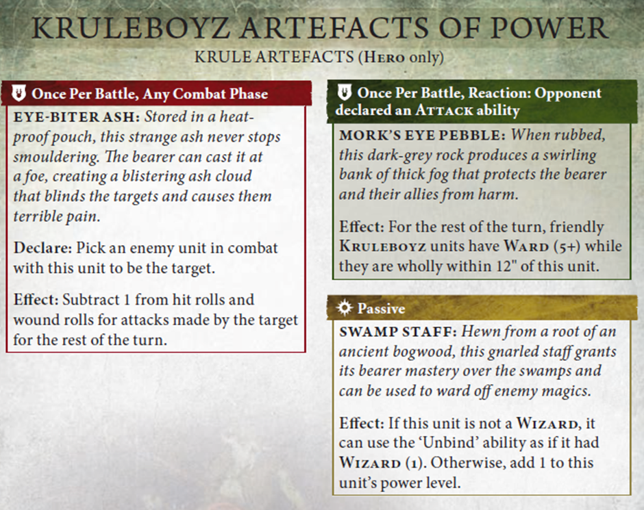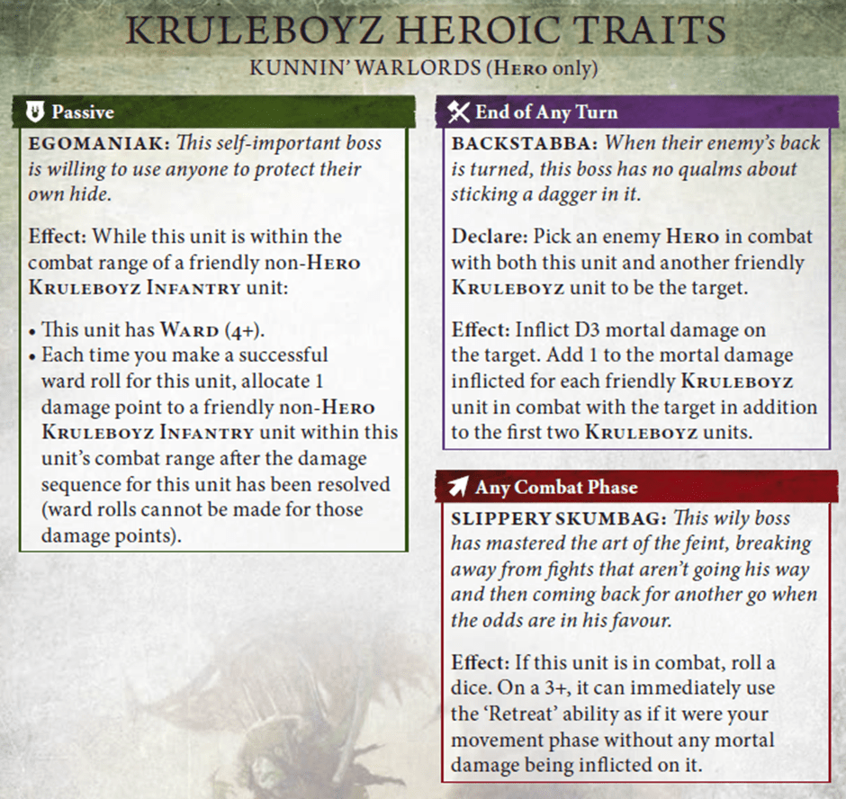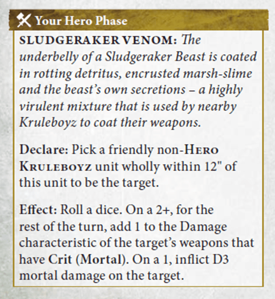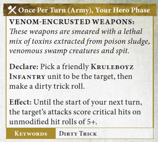 Venom-Encrusted Weapons is an absolute staple, and a core component of the Crit (Mortal) mega-combo outlined above. Whether you’re playing with or against Kruleboyz, you really need to focus in on that timing: Your Hero Phase.