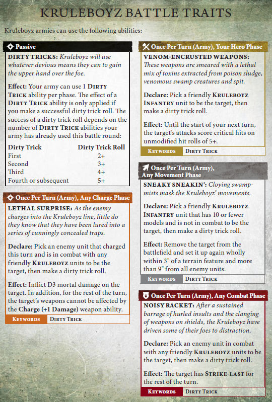I’ve only played 3 games with kruleboyz so far but they’ve been really fun. Sometime the dice can really deal you a bad hand. In one of my games vs nurgle I failed the 2+ sludgeraker venom ability 3 times, along with failing nearly all my dirty trick rolls. Definitely keeps you on your toes though.