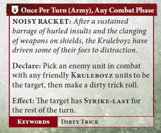 Noisy Racket. We love Noisy Racket, because it gives some much-needed play in Activation Wars. Can you imagine charging a unit of eye-wateringly expensive Brutes into some Gutrippaz, then they make you fight last and just bang mortals right through your premium 3+ save? Simply devastating into the right targets.