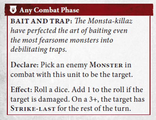 - Failed that Dirty Trick roll? Your hero with Slippery Skumbag can retreat away before they get to swing, or your Gutrippaz can put them on -1 to hit with their Scare Taktikz, both on 3+ rolls.