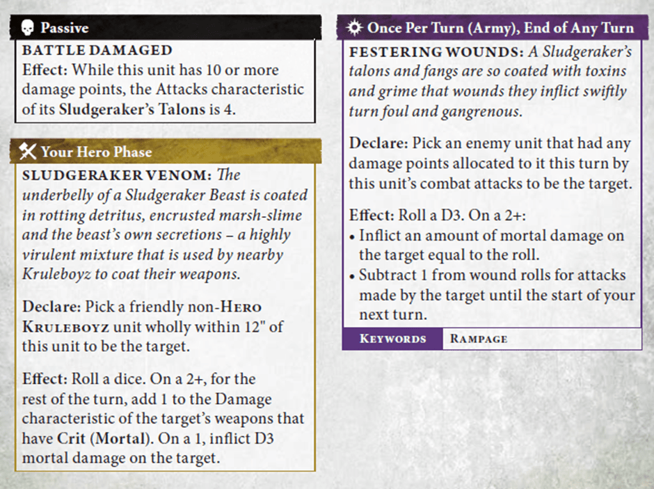 So if there’s a way to increase your damage characteristic (which there is in this book), then any Crits you bang out will benefit – which is a long way of saying that if you buff a unit of Gutrippaz with the Venom Encrusted Weapons battle trait (more on this below), and then also apply the Croc’s Sludgeraker Venom ability, every 5+ will be 2 mortal wounds and your normal attacks will all be Damage 2 as well: