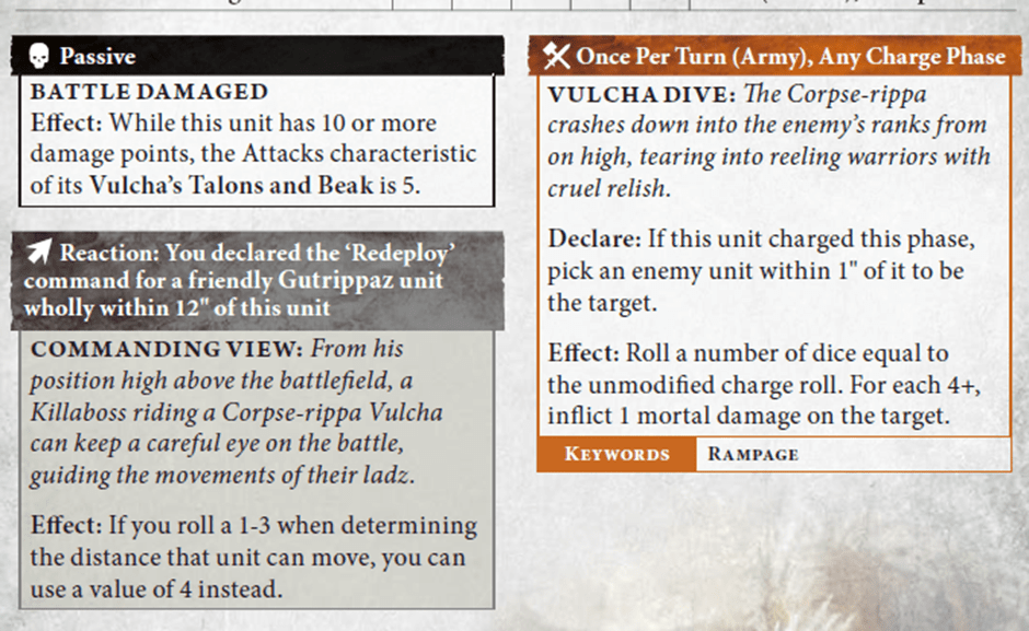 - Fail both (or want to preserve your DT rolls), and you can still Redeploy backwards. Yes every army has this, but your Gutrippaz can get a minimum 4″ from the Vulcha.