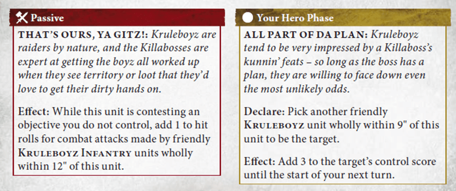 Mork’s Kunnin’ is Mystic Shield but for Koolboyz. Can layer it up with the Swampcalla’s Foul Elixirs to stack +2 to save on a unit (and offset rend), or protect multiple different units. The army doesn’t have the great armour saves to really abuse this but it’s always most welcome.