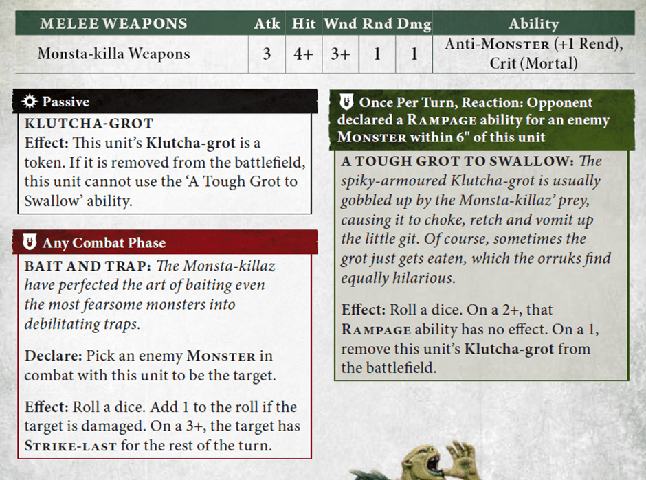 comically brokenfine. - Our own combat units are actually a lot better than they used to be at fighting chaff. Gutrippaz wounding on 3s (as Orruks should) and baseline rend 1 for the Monsta Killaz puts you back in the conversation. An unbuffed unit at least has a chance of knocking down say 20 Clanrats to the point were you out-cap them, which is fair enough for what both units are. If you want to reliably blast them off the table it’ll cost you a bit more, but it’s not the absolute drudgery it used to be.