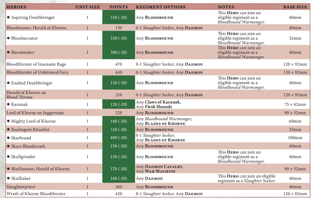 I still think we are about two updates away from any major impact on list building but there are a lot of drops for fun units here. Spamming Bloodbound heroes got a lot more affordable and the two Skarrs both came down a fraction. Three units that I consider very important for Bloodbound builds: Bloodstokers, Realmgore Ritualists and Wrathmongers all came down by a welcome 10 points. I may be flat out wrong with the Bloodbound thing, time will tell.