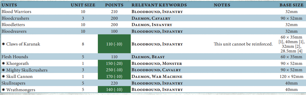 I know, they’re doing it to everybody. Still, the Index faction seemed to be costed of the strength of their old allegiance abilities. Somebody in the costing department seems to be think that Khorne can still slap a blob of 20 Bloodletters on the table whenever we get the urge. Probably the same somebody who didn’t notice that all Stormcast units got a 3+ save this edition. Khorne units tend to be be more expensive than their counterparts for no apparent reason.