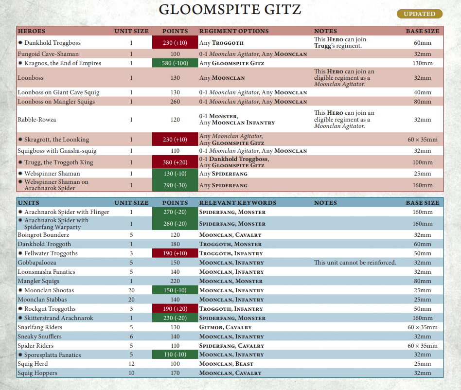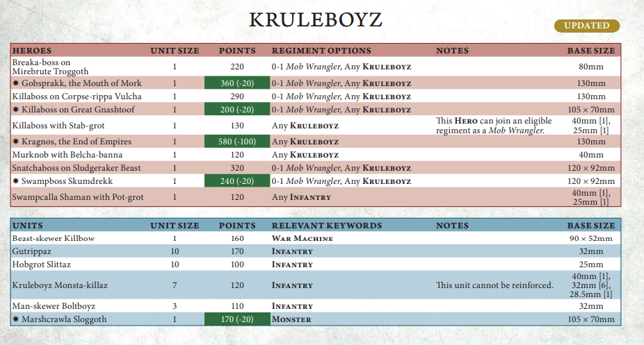 I’d class this Battlescroll update as a net negative to Kruleboyz – Bodyguard really is that good – so the static points on their efficient units was in fact much-needed. You do have the tools to play around it to a certain extent though – with your teleports and shooting, you’re not a complete hostage to fortune.
