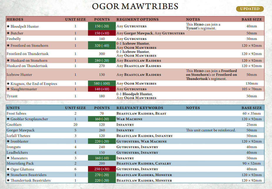 BCR got some points drops, but GW did such an awful job on them initially that they’re beyond salvaging. The one unit that could really have elevated the faction – the useful but overcosted Mournfang – was totally ignored and left to rot at 200 points (for 12 wounds on a 4+ save). Poor effort.