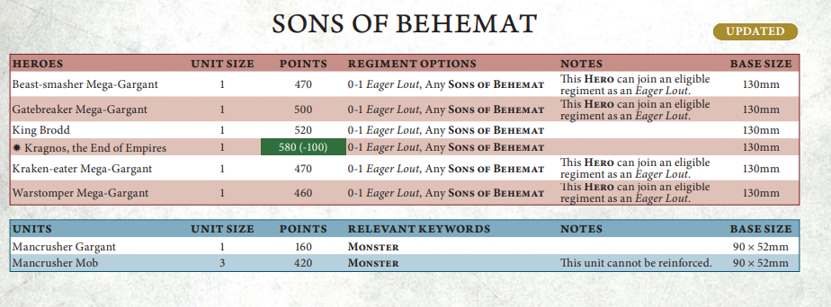 I’ve written loads on these chumps recently and nothing has changed. I still wouldn’t run Kragnos here, I still think the AOR is interesting, and I still think that running classic Sons of Behemat with Braggit’s Bottle Snatchaz is your best competitive bet.