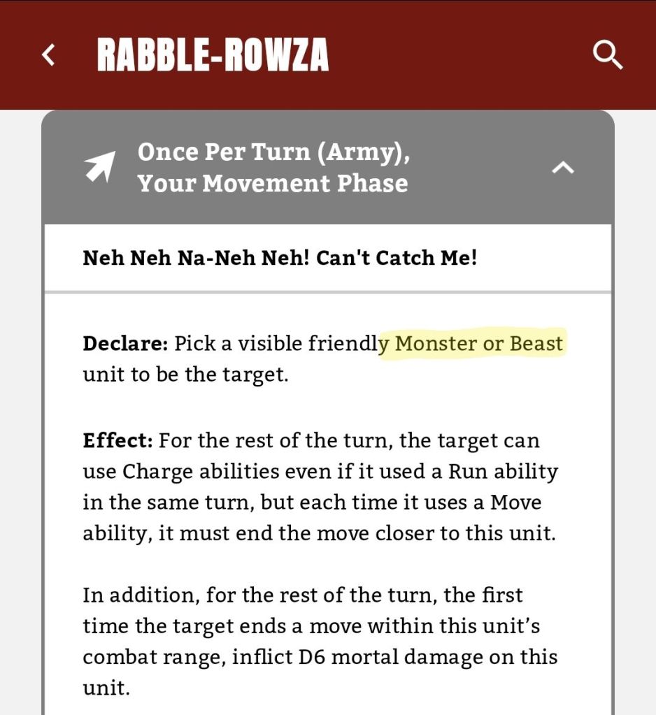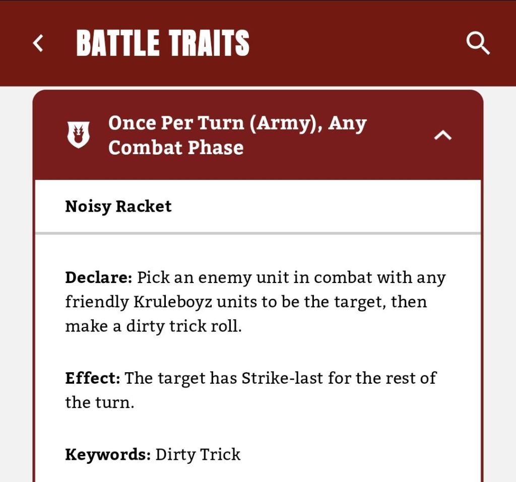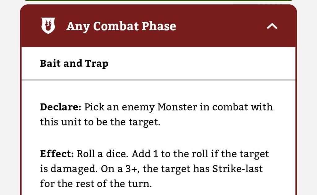 Secondly, if it is indeed a Monster Hero that we’re dealing with, you’ll have two opportunities to make it Strike Last. The Monster Killaz’ warscroll ability and the Dirty Trick give you two cracks at it: