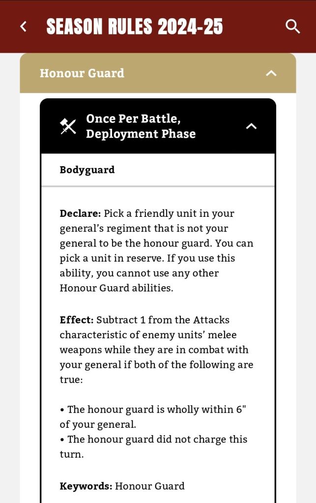 There’s a couple of ways we can address this, both in Listbuilding and on the tabletop. First thing to understand is that the main paradigm we’re teching for is “Big Killy Monster General With Damage Sponge Chums”. They’ll chuck him right up in your business and go to work, leaving you to flail around pathetically at -1 attack. So ideally we’ll carve that Bodyguard unit out of the army before we engage.