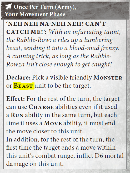- Getting there: The Rabble Rowza allows those Herd (or Kraggy) to run and charge while Kraggy himself makes them charge 3D6. The wee man will probably pick you up a BT too, if you can drop him onto terrain, which brings us to…