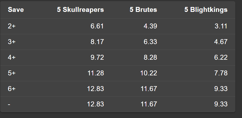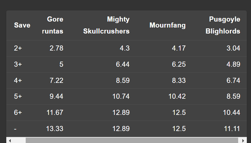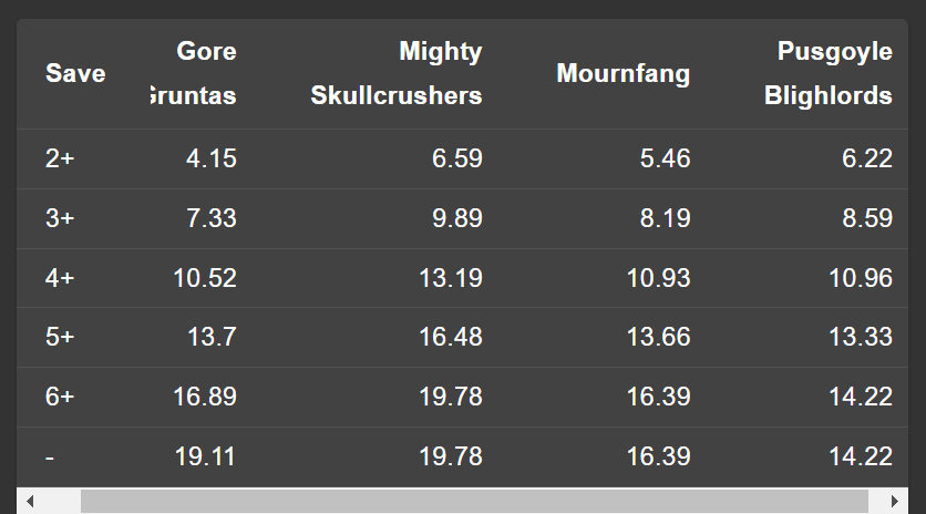 Ouch. I was honestly surprised at what a poor class of damage dealers the Big Base Cav10 had become but when you are being outworked by Mighty Skullcrushers, you really are in trouble. Now I realize that the passionate defender of Nurgle11 would be insisting that we apply the buffs to this one. Pusgoyles do get a few.