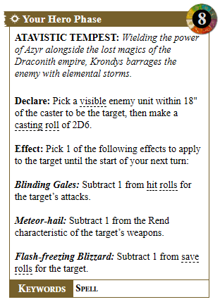 - One enemy unit also gets -1 to hit, or -1 to rend, or -1 to saves from Krondys’s warscroll spell Atavistic Tempest.