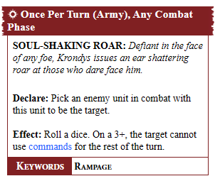 Meanwhile, Karazai just slaps the shit out of you, including a sick Calamitous Tail Sweep Rampage in the combat phase that lets you roll a dice for each model in the target unit, and each 5+ is a mortal damage. He’s also a big, mean motherfucker that pulls a Skarbrand when he takes damage, getting more and more attacks as his health goes down (+1 attacks with 5-9 damage, +2 attacks with 10 or more damage on him), meaning he hits like an entire army when at half-health or lower. But good luck hurting him, because he can also make an enemy unit in combat with him -1 attacks in each combat phase with the coolest named ability ever, Ancient Master of War7.