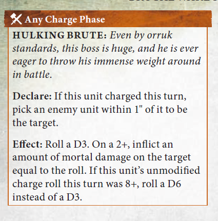 As a Warlord he unlocks some unit choices that can otherwize be hard to fit into Regiments, everyone loves a 3D6 charge and the cobber slaps. That 4+ save makes him too easy to kill but he does offer hard synergy in Ironjawz since he makes it exponentially easier to hit those 8+ charges and trigger bonuses: