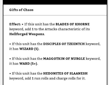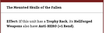 As for Heroic Traits and Artefacts there isn’t much going on. Favored of Khorne and starting with a Blood Tithe is the auto-include trait. It’s a choice between the Collar of Contempt (which is your only unbind if you aren’t rocking a Slaughter Priest) and Ar’gath: