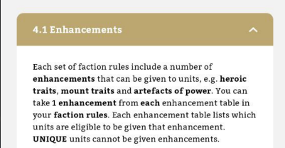 …He specifically gets that faction keyword, making him eligible for enhancements. And finally, we can double-check that heroic traits and artefacts are indeed enhancements: