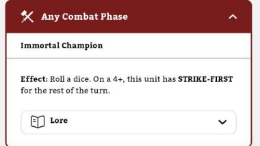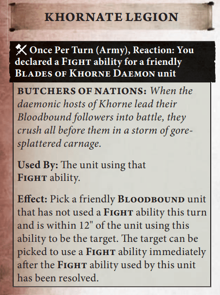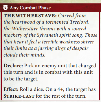 A lot of Strike Firsts are charge activated but this bad boy works in any combat phase. The 4+ is too flaky to rely on and you will end up treating this as a bonus free hit in most factions. That said, it is way too useful for your opponent to ignore completely when he attacks you. Nobody wants some Daemonic freak getting lucky and murdering a few Karenguard before they have had a chance to pile in. The real value here might be messing with your opponent’s planning.