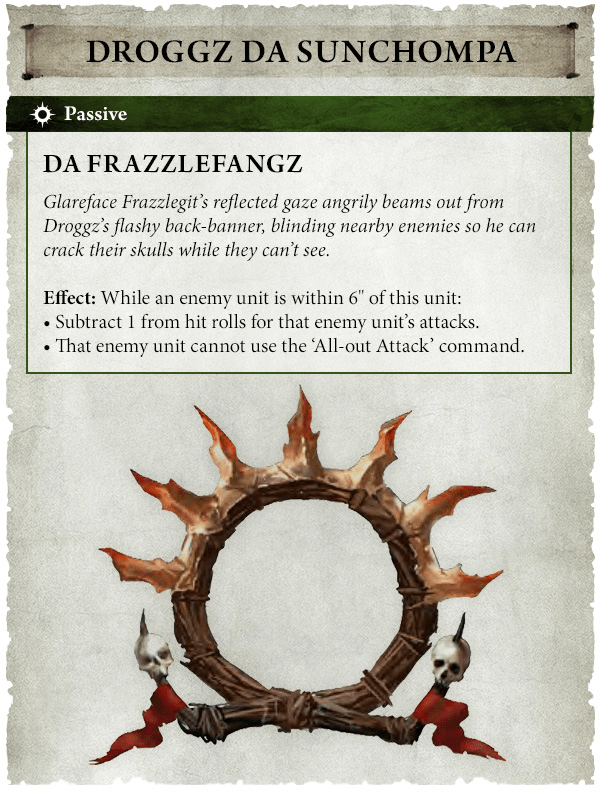 For each dice you reroll, every attack drops a pip of rend, which will create some really interesting decision points. There’s a world where this warmachine could have targeted heroes as the little Grot pilot pivots mid-air, but that’s not the case, so you’re probably left using this thing as an Elite killer.