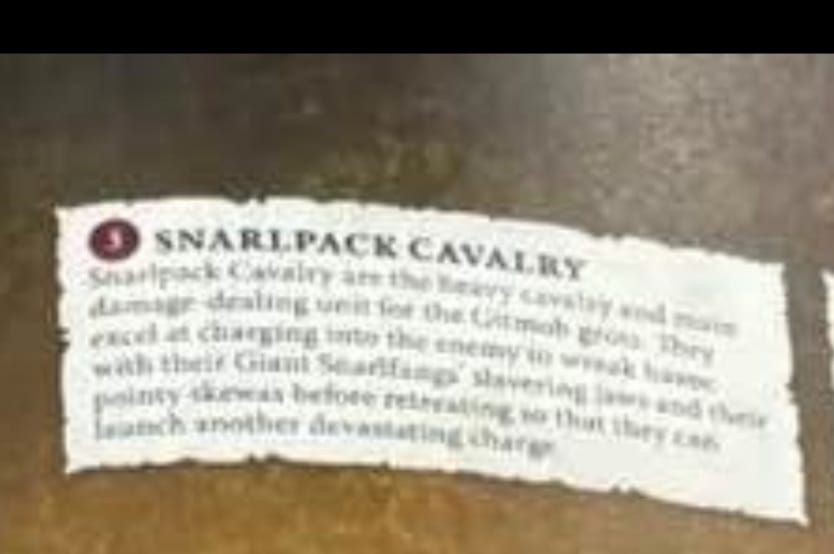 This one however is a miss. Described as “the closest thing that the Gitmobs have to shock troops”, hats off to the fluff writer for having the nous to recognise that they are actually no such thing. We’ve already got light cav in this army in the shape of the existing Snarflang Riders, so the Snarlpack’s role is heavy cav, which can mean one of two things1: