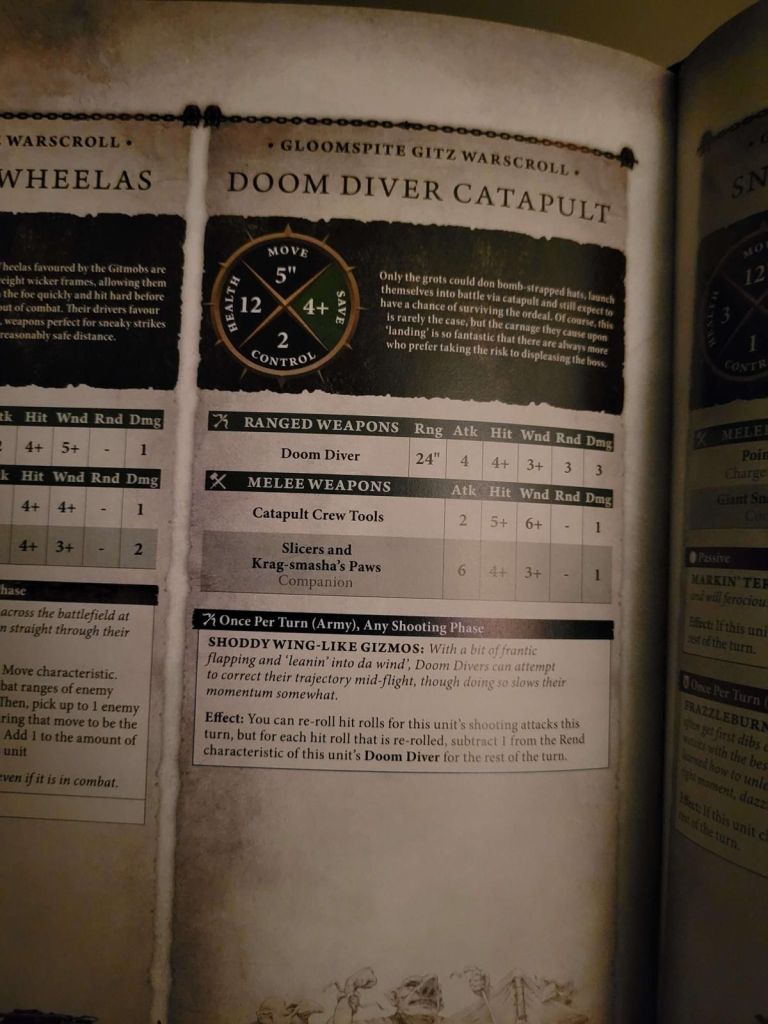 The heavy cav are a crushing disappointment, but there are still some interesting rules and units in here. The debuffs from the boss are great, but probably best applied to true bruisers from the Not Gitmob sections of the book; and tarpitting opponents while your Doom Divers bang away sounds like fun4, but those tarpits are probably going to be reinforced Grots or Troggs5.