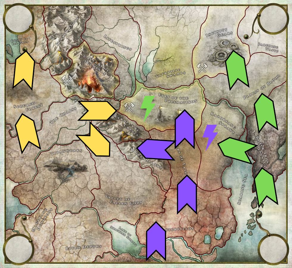 The Corsairs have swept directly north, looking to ransack those rich and unguarded lands. The Cult of the Agloraxi made a move for the centre of the board while the Lords in Exile have pushed aggressively inland, with the result that our factions are now butting up against each other, and any further expansion is likely to mean directly conquering each other’s lands: